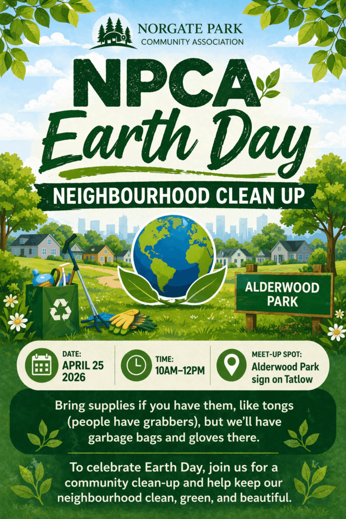 Hello everyone. Earth Day is coming up on Wednesday, April.22nd, and we’re organizing another Norgate cleanup for Saturday, April.25th. We’ll be meeting for 10:00 am and will go till about 12:00 pm. We’d like to see a good turnout this year and hope to see a lot of you there. Please bring gloves, garbage bags and grabbers are good as well. We’ll have garbage bags and gloves there as well. We’ll meet at the Alderwood Park sign on Tatlow. Hope to see lots of you there! It would be helpful if you could message myself or Sandra Orton-Tweed and just let us know if you’re planning on attending, just so we have an idea on numbers. Come on out and help to cleanup our Community! (On behalf of the Norgate Park Community Association)